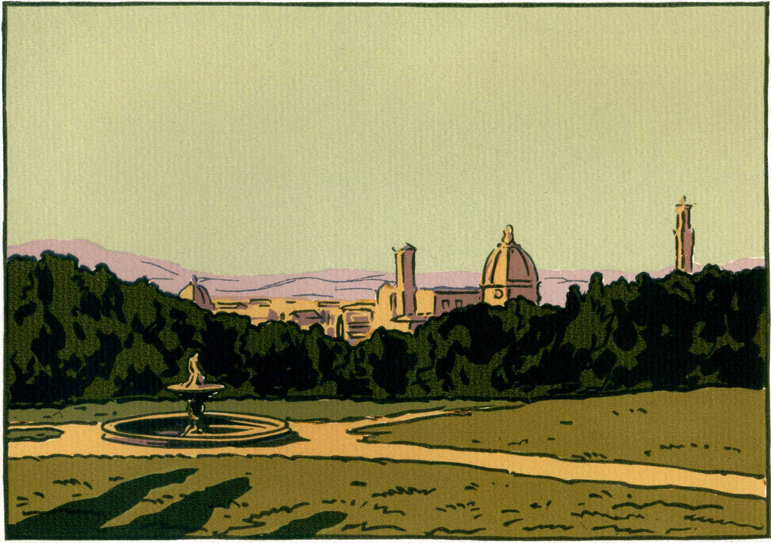 On a planté, à gauche, sur l'arête de la colline, une forte haie de cyprès où vient se briser le regard ; en sorte que les yeux sont nécessairement rejetés à droite vers la vallée et sur la plaine. Cette fine violence était à peine utile car la vallée contient Florence épanouie avec ses clochers et ses dômes, et la plaine comprend les jardins de Florence, avec le pays tributaire. Beau et riche pays, étoffe magnifique où furent taillés les chefs-d'œuvre et les grands hommes, on veut monter plus haut pour l'embrasser dans sa véritable étendue. #