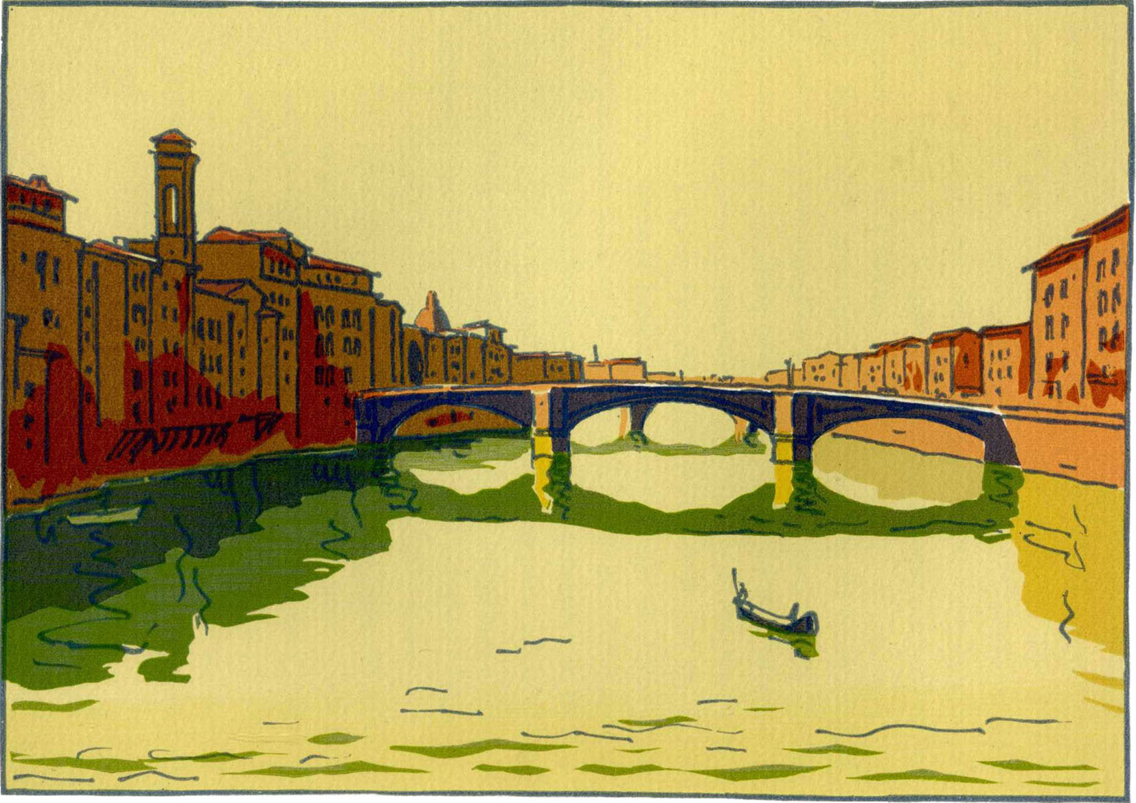 Quel désert, l'Arno à Florence ! En huit jours je n'ai pas vu trois embarcations. Unie comme un miroir, l'eau ne porte que des reflets. Maisons, palais, masures s'y regardent du haut des rives. Au midi, depuis le pont de la Sainte-Trinité jusqu'au delà du Pont Vieux, il n'y a point de quai, le pied des édifices enfonce tout droit dans le fleuve. Il faut voir au soleil couché la couleur vigoureuse, la hautaine et forte structure de ces façades florentines, toutes blessées, lépreuses, avec leurs croisées en arceaux et leurs corniches en dentelle, se refléter fidèlement dans cette longue nappe nue, que le ciel occident trempe de rose et d'un or glauque. On dirait un recueil de souvenirs mystérieux arrêtés au poinçon sur des bandelettes de bronze. #